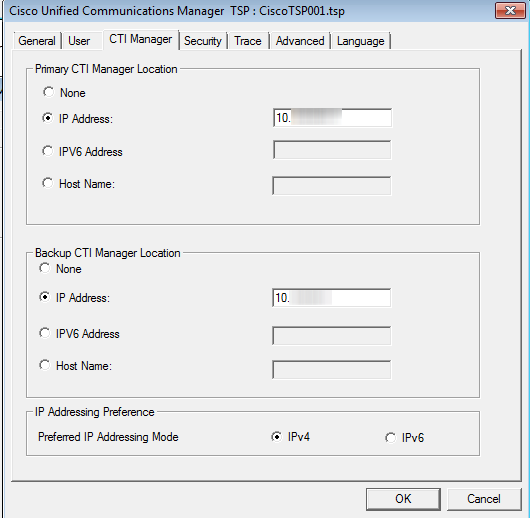 18. On the CTI Manager tab, enter the IP address(es) of your Cisco serversIPs